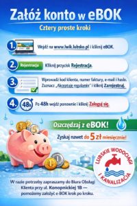 💻 e-BOK – prostsze, niż myślisz! Załóż konto w e-BOK w kilku prostych krokach i załatwiaj swoje sprawy szybko, wygodnie i bez wychodzenia z domu. Podgląd faktur, kontrola płatności, wszystko w jednym miejscu – 24/7 👍 💡 Dlaczego warto? ✔ oszczędzasz czas ✔ masz stały dostęp do swoich danych ✔ możesz zyskać nawet do 5 zł miesięcznie A jeśli potrzebują Państwo pomocy na miejscu – 📍 zapraszamy do Biura Obsługi Klienta przy ul. Konopnickiej 1B. Pomożemy założyć e-BOK krok po kroku 😊 👉 Wejdź na https://ebok.lwik.pl/ i przekonaj się, jakie to proste!